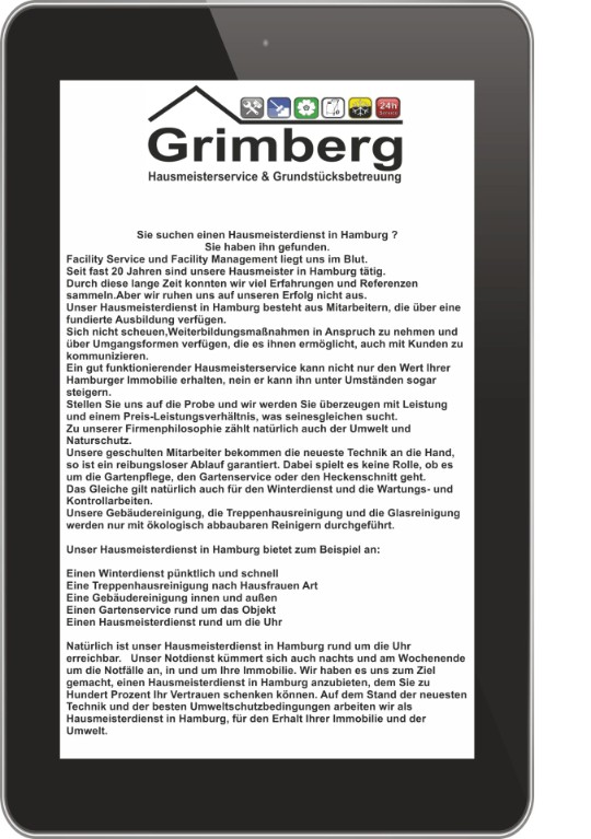 Natürlich ist unser Hausmeisterdienst in Hamburg rund um die Uhr erreichbar. Unser Notdienst kümmert sich auch nachts und am Wochenende um die Notfälle an, in und um Ihre Immobilie. Wir haben es uns zum Ziel gemacht, einen Hausmeisterdienst in Hamburg anzubieten, dem Sie zu Hundert Prozent Ihr Vertrauen schenken können. Auf dem Stand der neuesten Technik und der besten Umweltschutzbedingungen arbeiten wir als Hausmeisterdienst in Hamburg, für den Erhalt Ihrer Immobilie und der Umwelt.